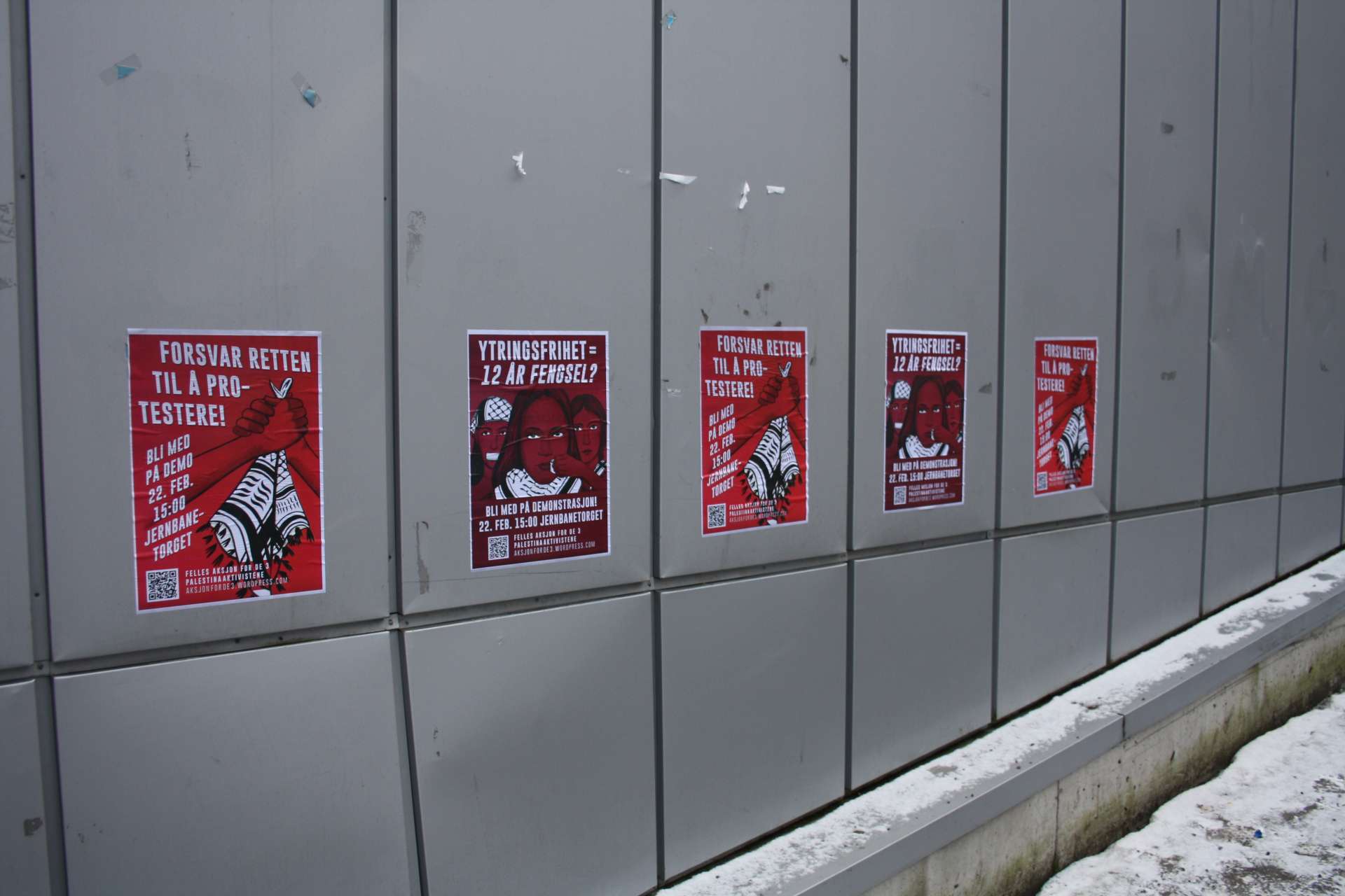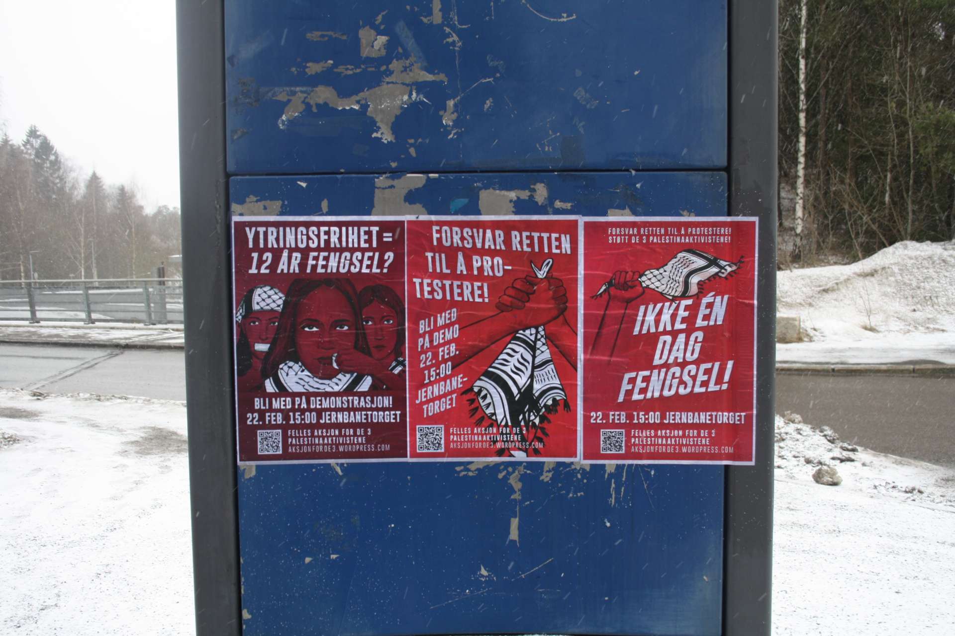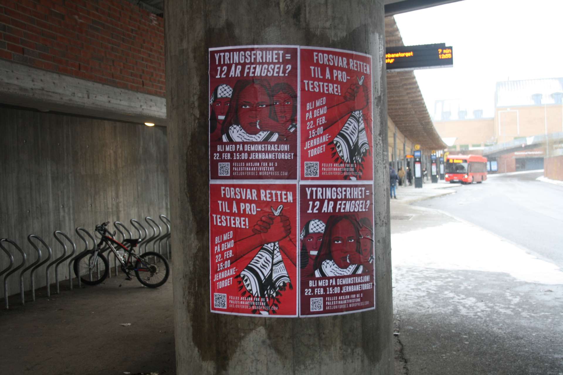 Aktivister fra Kampkomiteen i Oslo har hengt opp plakater som mobiliserer til en demonstrasjon til støtte for de 3 siktede palestinstaaktivistene.