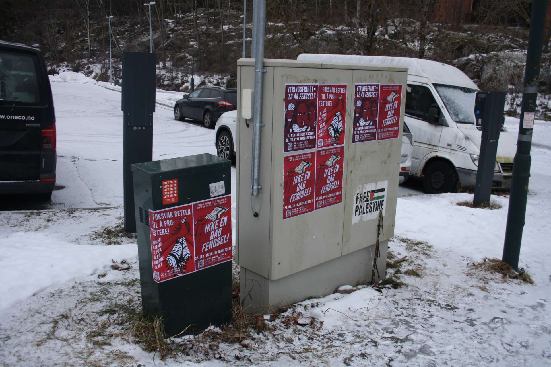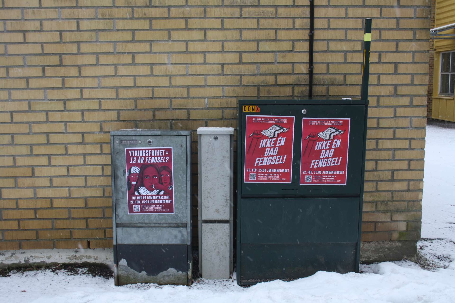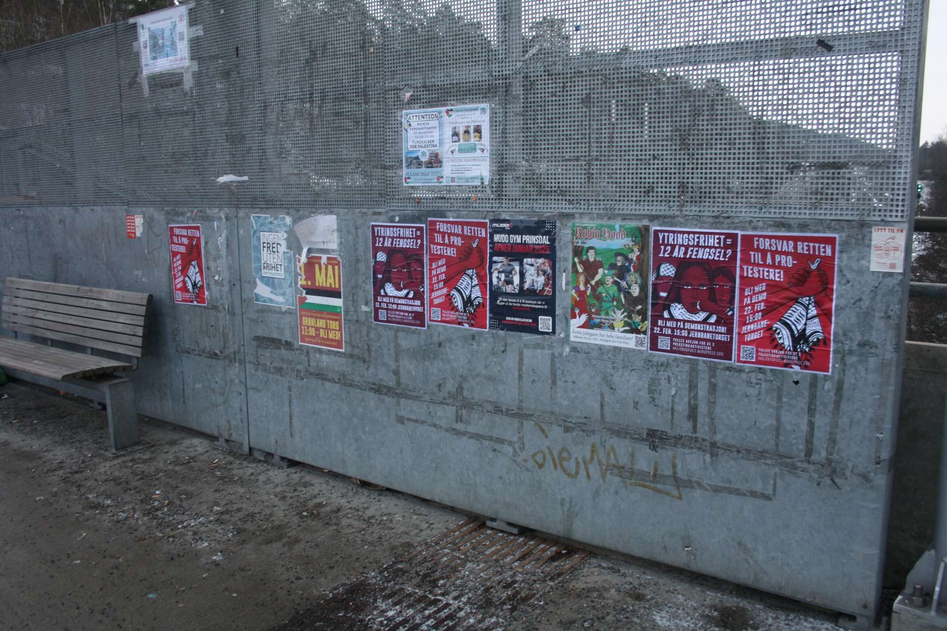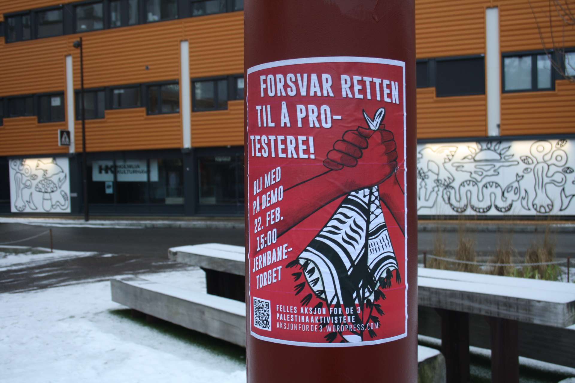 Aktivister fra Kampkomiteen i Oslo har hengt opp plakater som mobiliserer til en demonstrasjon til støtte for de 3 siktede palestinstaaktivistene.