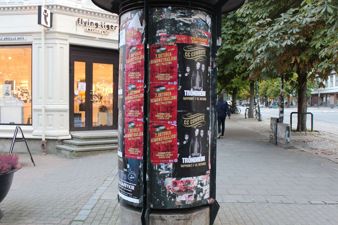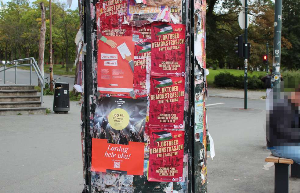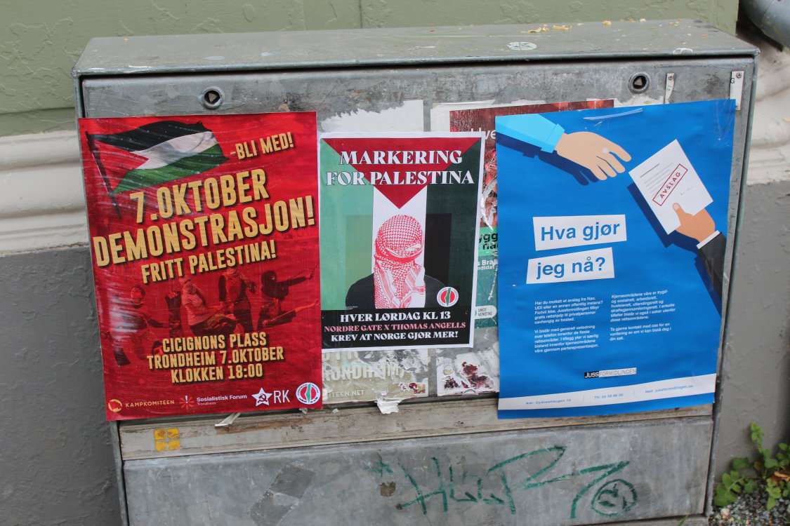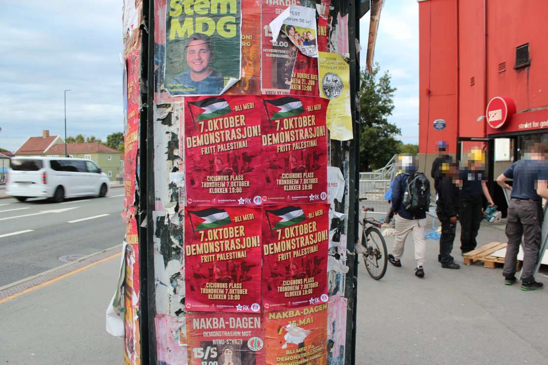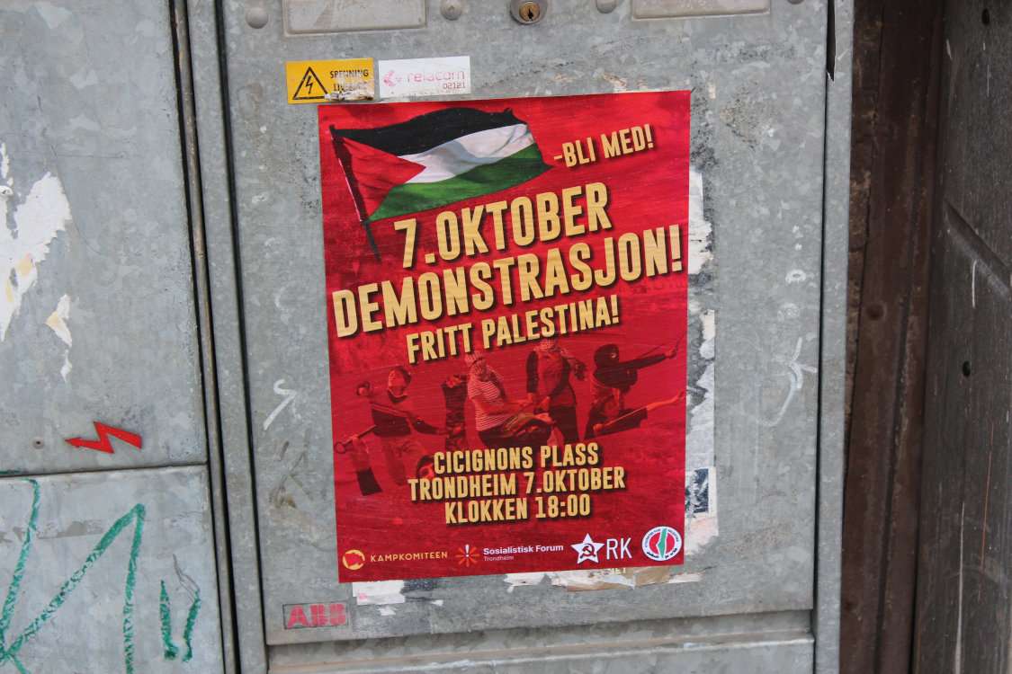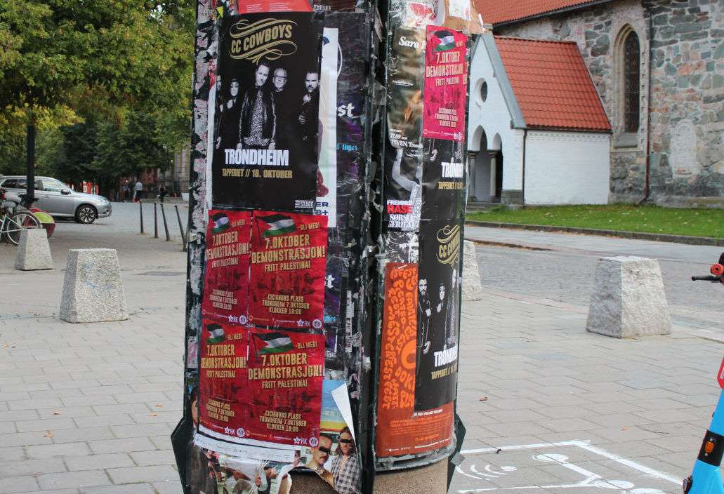 Plakatene ble satt opp i Trondheim sentrum for å mobilisere til demonstrasjon til støtte for den palestinske motstandskampen tirsdag 7. oktober.