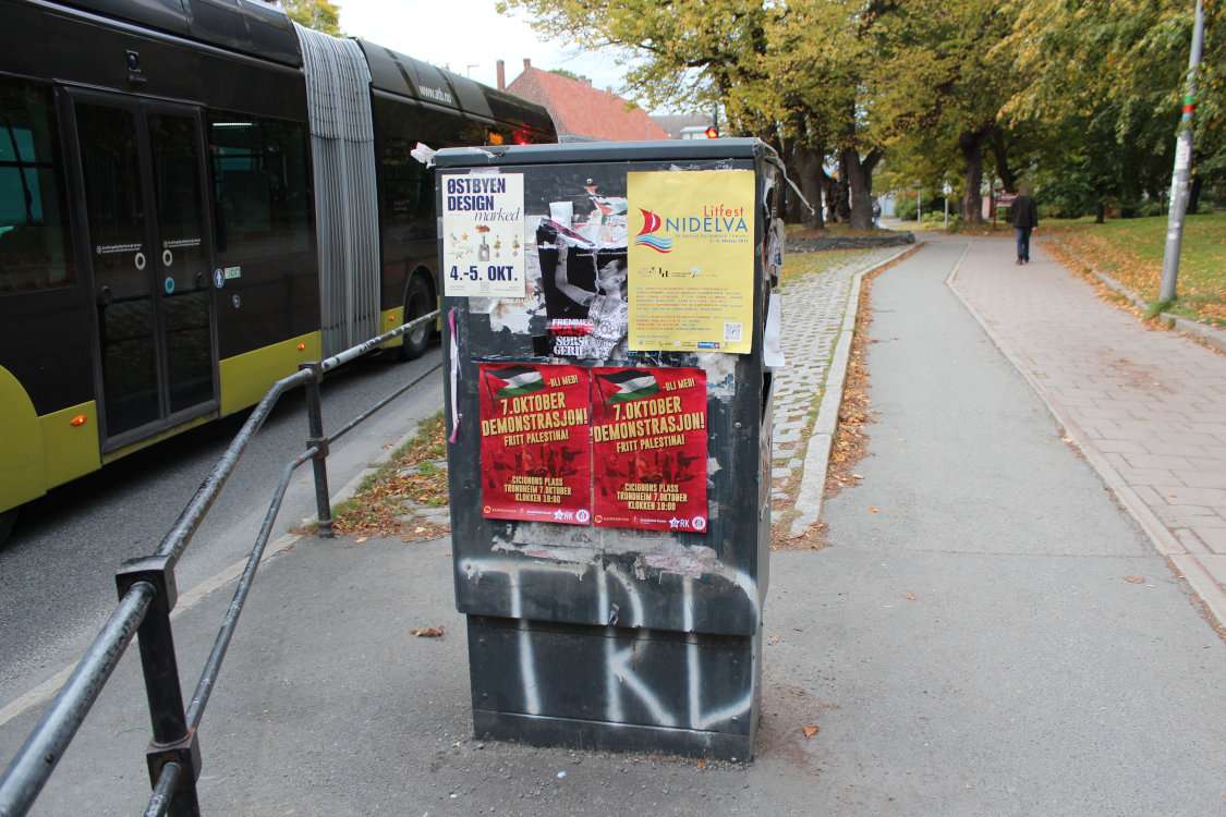 Mandag 29. september ble det satt opp plakater for Palestina-demonstrasjon.