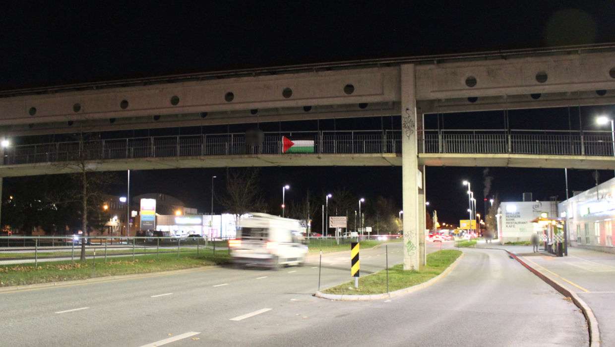 Flagget ble satt opp på ei gangbru på Tiller sør i byen, like ved kjøpesenteret City Syd, over en vei med svært mye trafikk.