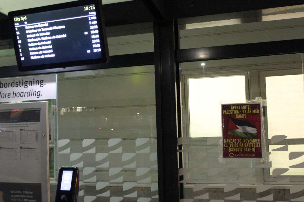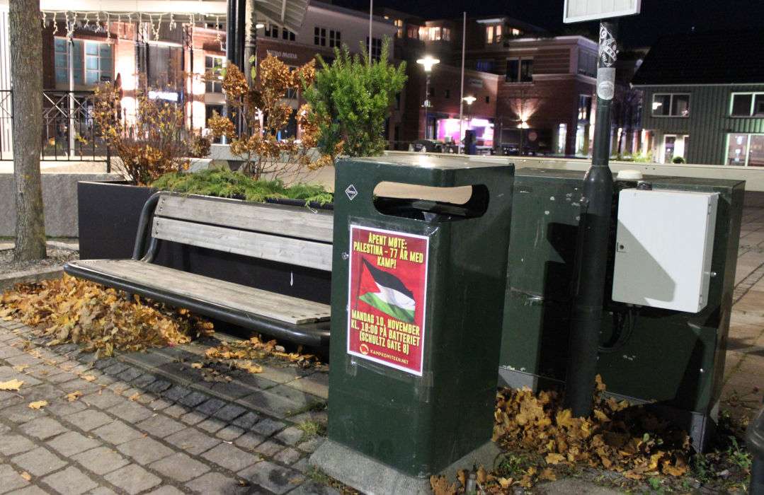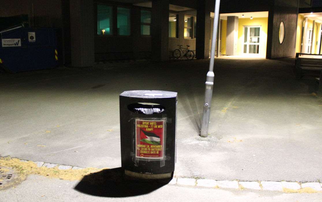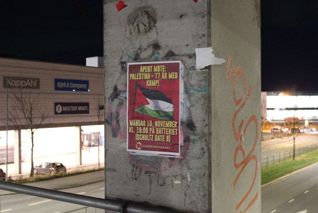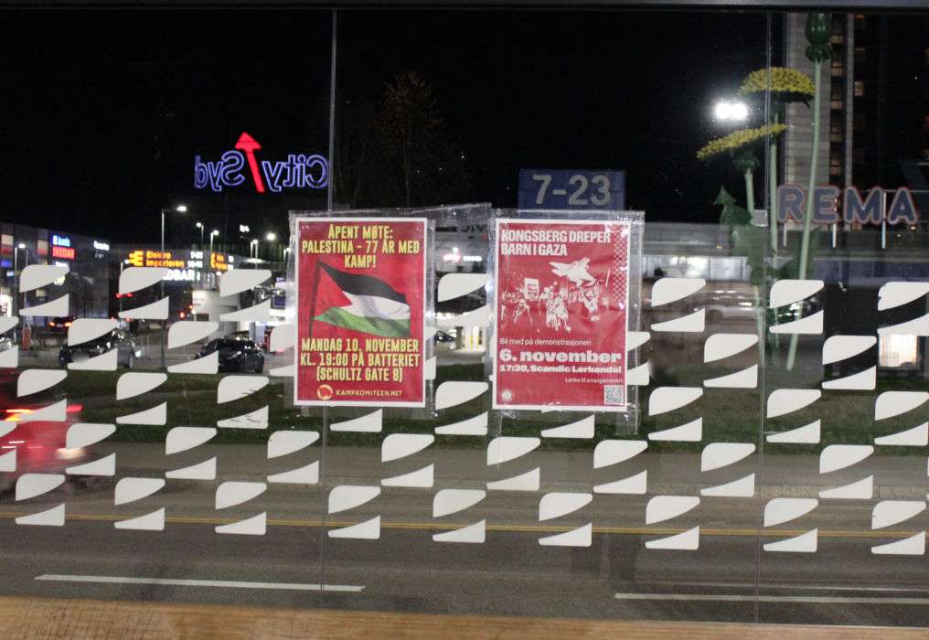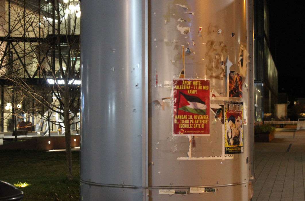 I dette området ble det også satt opp plakater. Plakatene mobiliserte til åpent møte om den palestinske motstandskampen, mandag 10. november kl. 19:00 på Batteriet (Schultz gate 8). Det ble også satt opp plakater for en demonstrasjon mot Kongsberg Gruppen, som Studenter for Palestina og Palestinakomiteen arrangerer. Demonstrasjonen er torsdag 6. november kl. 17:30 utenfor Scandic Lerkendal.