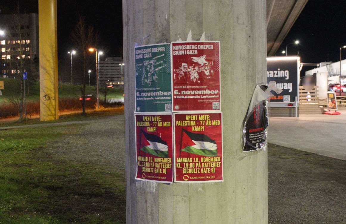 Mandag 3. november satte aktivister opp plakater for åpent møte og en demonstrasjon mot Kongsberg Gruppen. Det ble også satt opp et palestinsk flagg.
